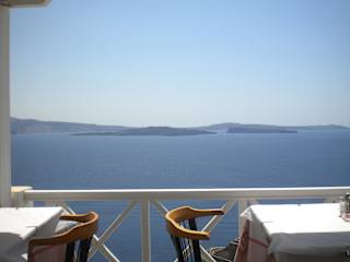 Mitten in der Altstadt gleich an der Kirche von Panagia gelegen hat man von der tollen Dachterasse des Restaurant einen wahrlich wunderbaren Ausblick auf Altstadt, Kirche und die Inselkante mit Vulkaninsel. Man sitzt von Stoffsegeln vor der prallen Sonne geschützt und es macht auch kein Probleme, wenn man nur einen Kaffee bestellt. Entspannte Atmosphäre und vermutlich der beste Ausblick von ganz Oia.