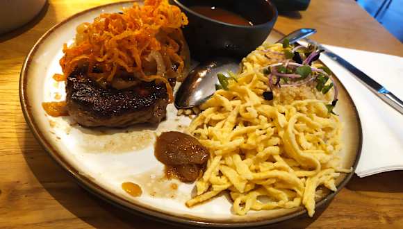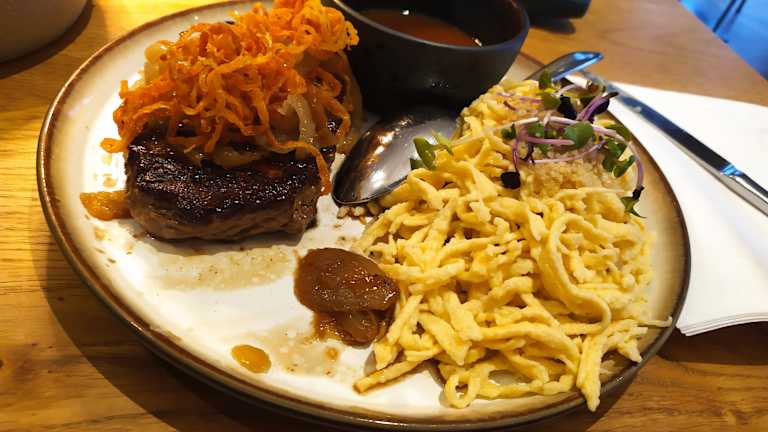 Das Restaurant war bei unserem Besuch sehr voll - wir hatten zum Glück einen Tisch reserviert. Das Essen kam relativ zügig obwohl so viel los war und war prima. Parkplatz: Ein Stück entfernt. War schlecht beleuchtet. Wenn man mit älteren Personen, welche nicht mehr gut zu Fuß sind, unterwegs ist entweder diese beim Restaurant absetzen und dann Auto auf dem Parkplatz abstellen oder falls diese doch das Stück laufen möchten evtl. Taschenlampe mitnehmen (oder Smartphone entsprechend nutzen).