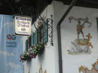 Das Restaurant Loisach Stuben befindet sich in der Fürstenstraße 4 in Garmisch, in einem Gebäude mit schöner Lüftlmalerei. Es ist ca. 50 bis 300 Meter von der Straße Am Kurpark bzw. Marienplatz entfernt (je nach Standort in der Straße Am Kurpark bzw. am Marienplatz). Wir waren hier an einem schönen, warmen Juni-Abend und fanden einen Platz im Außenbereich des Lokals in der Fürstenstraße, direkt vor den Loisach Stuben. Auf der Speisekarte findet man überwiegend kroatische und deutsche Speisen. Ich entschied mich für Pola-Pola (Halb und Halb), bestehend aus 1x Ražnjići / Fleischspieß und 3x Cevapcici / kroatische Hackfleischröllchen, mit Djuvecreis, Pommes, Zwiebeln und Ayvar. Das Essen war sehr gut, der Chef des Hauses, der auch im Service tätig war, war äußerst freundlich und aufmerksam (jedoch nicht aufdringlich) und die Preise waren durchaus o.k. (für Garmisch würde ich sagen, es war günstig). Der alte Name der Loisach Stuben war wohl Torggelstube, zumindest ist dieser Name noch in den Lüftlmalereien vorhanden.