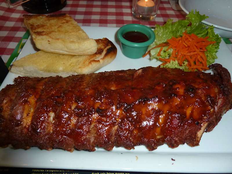Wer Lust auf amerikanische Gerichte hat, ist hier richtig, die Qualität aus den USA wird nicht erreicht. Das Restaurant ist amerikanisch Nachempfunden und mit Sportartikeln dekoriert. Fernseher zeigen laufend Sportprogramme, die Einrichtung ist rustikal. Die Karte ist klar amerikanisch ausgelegt. Es gibt alles von Burger, bis zu Rips oder dem klassischen Steak. Ich habe mich für die Rips entschieden und meine Frau ein Steak. Das Essen war nicht schlecht. Das Personal bestand aus unserer Sicht aus ungelernten Kräften, war aber freundlich. Es war sehr voll zum Glück hatten wir reserviert. Die Wartezeit war doch etwas länger, die Getränke kamen aber schnell. Wer es amerikanisch und rustikal mag ist hier richtig, die Gäste waren eher jünger.