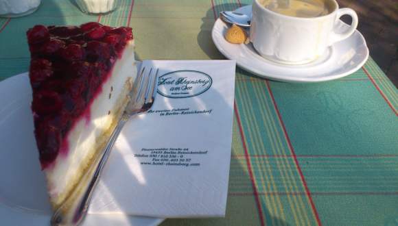 Ich war heute mit meiner Tante, die im Märkischen Viertel, unweit des Hotels "Rheinsberg am See" wohnt spazieren und wir haben im Hotel dazugehörigen Café / Biergarten Pause eingelegt. Die Lage ist ziemlich ruhig in Mitten des Märkischen Viertels in einer Grünanlage mit See gelegen. Genauso gut aber ist man von dort aus binnen weniger Minuten im "Märkischen Zentrum", der Einkaufspassage des Viertels. Die Einrichtung wirkte auf mich gepflegt, entsprechend eines 4* Hotels. Die Himbeer-Sahne Torte schmeckte vorzüglich. Der Tortenboden war schön weich und nicht hart und fest, wie man es sonst so oft erlebt. Die Mitarbeiter waren freundlich gewesen, wirkten aber auch deutlich gestresst, wegen des hohen Gästeaufkommens und im Café selber war wohl noch eine Feierlichkeit, die es zu bedienen galt.