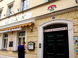 Das „Rixx“ liegt in der Austraße im Herzen der Bamberger Altstadt und seit 10 Jahren dreht sich in dem kleinen Restaurant alles um die Currywurst. Mehr als 20 verschiedene Variationen, die von einem Metzger aus dem Umland produziert werden, stehen auf der Speisekarte: Von „Klassisch“ bis „Dracula“ (mit viel Knoblauch), vegan, mit Safran und Ananas oder aus Pferdefleisch („Domreiter“) – die Auswahl ist wahrlich erschlagend und die Besonderheit liegt in der Tatsache, dass die geschmacksbestimmenden Zutaten bereits bei der Herstellung in die Füllung der Würste eingearbeitet werden. Serviert wird die Currywurst im „Rixx“ klassisch mit Pommes frites und einer der drei hausgemachten Saucen, deren Schärfegrad der Gast frei wählen kann. Mit den Fotos amerikanischer Filmschauspieler an den Wänden, einer superfreundlichen Bedienung und dem etwas altmodischen Flair des Gastraumes ist das „Rixx“ in Bamberg die fraglos kultigste Adresse, wenn der Sinn nach einer erstklassigen Currywurst steht.