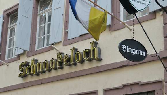 Das historische Gasthaus Schnookeloch befindet sich in der Haspelgasse 8, in der Altstadt von Heidelberg, ca. 100 Meter nördlich von der Heiliggeistkirche. Das Schnookeloch verfügt über Sitzplätze im Lokal, sowie im Biergarten hinter dem Gebäude und im Freien auf der Haspelgasse vor dem Lokal. Wir waren hier am ersten Abend, den wir in Heidelberg verbrachten, zum Abendessen. Wir fanden einen Platz im Freien in der Haspelgasse, vor dem Gasthaus, wo wir einen schönen Blick genießen konnten. Auf der Speisekarte stehen u.a. auch diverse regionale Spezialitäten. Ich hatte mich für eine Portion geräucherte Ochsenbrust mit Meerrettich-Sahne-Soße, Preiselbeeren und Dampfkartoffeln entschieden, die sehr gut war. Das Schnookeloch ist nach meiner Meinung eines der preiswerteren Altstadtrestaurants. Das historische Schnookeloch ist ein altes Studentenwirtshaus und wie es heißt, haben heute noch fünfzehn Studenten-Verbindungen ihren Stammtisch im Schnookeloch. Davon zeugen u.a. die Wappen im Lokal, sowie Fahnen am Gebäude. ÜBRIGENS: Schnooke bedeutet soviel wie Witz.