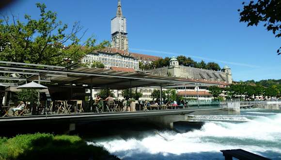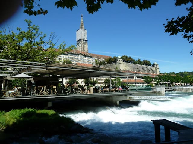 Unbeschwert relaxen direkt am Fluss (Aare). Prächtiger Blick von unten auf die Kulissen der Berner Altstadt (UNESCO-Welterbe). Im Schwellenmätteli gibt es ein authentisches italienisches Restaurant, zwei Terrassen, und eine Lounge. Auf der Terrasse direkt am Fluss lässt es sich gediegen Hängen, chillen und sich einen der zahlreichen Cocktails genehmigen. Unbedingt "Blanc Cassis" probieren (Crème de cassis mit Weisswein, kostet 7.-). Hier heissen die alkoholfreien Cocktails übrigens "Mocktails". Umfangreiches Tee-Angebot. Zu Fuss kann man nachher der Aare entlang, flussabwärts zum Bärengraben wandern. Flussaufwärts geht es in Richtung des berühmten Marzili-Bades. Am Abend empfiehlt sich eine leichte Jacke dabei zu haben; es kann recht zügig werden.