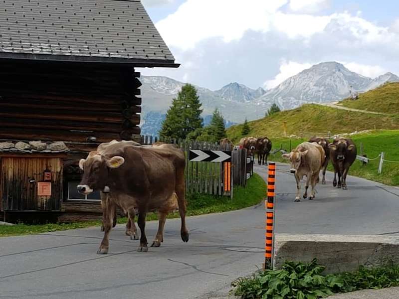Wir kamen den Wanderweg von der Rinerhornbahn, über den Hubel nach Sertig Dörfli. Die Terrasse de Restaurants war sehr gut gefüllt, aber mit 2 Personen bekamen wir noch einen freien Tisch. Die Bedienung war sehr freundlich, musste aber durch die vielen Gäste laufen was das Zeug hielt. Die Wartezeiten waren trotzdem nicht zu lang und angemessen. Wir bestellen Rösti mit 2 Spiegeleiern und dazu einen Blattsalat. Das konnten wir uns sehr gut teilen und wurden satt. Dazu ein leckeres Bier und die km waren schnell vergessen. Rösti mit 2 Spiegeleiern 19.50 CHF und der Salat 8 CHF. Allerdings sind die Weinpreise sehr hoch 0,1 kostet ab 5,80 CHF. Einen Tag später waren wir nochmal beim Bergführer essen. Da der Weg vom Jakobshorn uns wieder in den Ort führte. An dem Tag entschieden wir uns für Fleischkäse mit Kartoffelsalat für 18,50 CHF und Aelpler Macceroni eine kleine Portion für 15 CHF. Den Affogato mit Vanilleeis in einem Espresso kannten wir ja schon und bestellten ihn wieder, bzw. mein Mann dieses Mal einen Eiskaffee. Alles war sehr lecker und am 2. Tag warteten wir auf den Bus und nutzen nach dem Essen die Liegestühle im Schatten mit den Eiserfrischungen. Ein perfekter Ort zum Essen und Ausspannen.