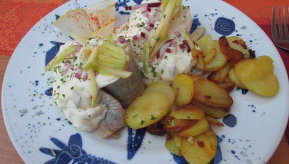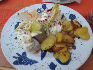 Unser Essen, gebratene Scholle mit Salzkartoffeln. Katoffeln ohne Sauce, wurde auf Anfrage nachgebracht!