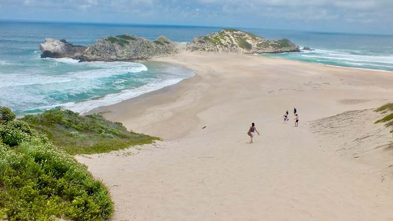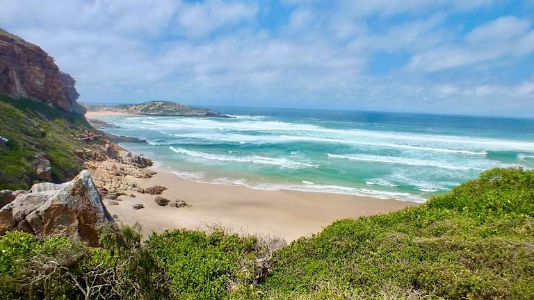 Wir waren an einem Sonntag im afrikanischen Winter dort und bekamen trotzdem einen Parkplatz. Zunächst hatten wir vor, links herum an der Küste entlang, hier trafen wir auch einen Hai-Beobachter, aber hierzu muss man im weiteren Verlauf schon ziemlich schwindelfrei sein, so dass wir zurückkehrten. Anschließend liefen wir geradeaus vom PP auf dem Sattel und kamen an einen wunderschönen Aussichtspunkt, The Gap genannt. Hier hat man Blick auf das Meer und nach Norden Richtung Plettenberg, aber noch schöner nach Süden auf eine unendlich lange Sandbucht. Ab diesem Punkt muss man wieder schwindelfrei sein und für den steilen Abstieg feste Schuhe anhaben. Leider fehlte der Hinweis auf Trittsicher- und Schwindelfreiheit!