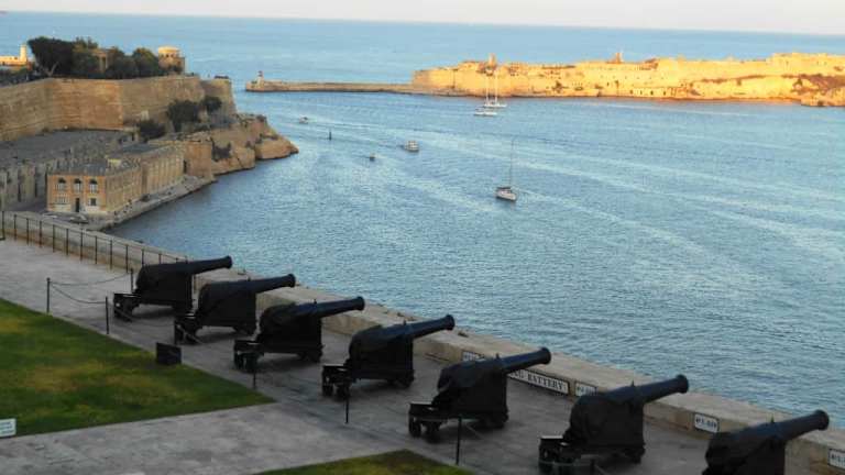 Von den Upper Barrakka Gardens gut einsehbar stehen die historischen Kanonen hoch über Vallettas Grand Harbour auf der östlichen historischen Befestigungsmauer. Mittags um 12 Uhr wird ein Schuss abgefeuert, der den Seeleuten einst für die Einstellung ihrer Uhren diente, inzwischen aber hauptsächlich eine touristisch interessante Tradition ist.