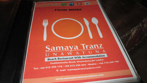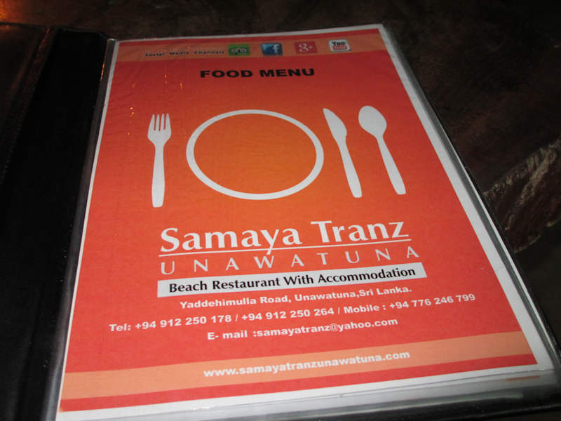 Wir wollten eigentlich im "Kingfisher" zu Abend essen, dort haben wir aber keinen Tisch mehr bekommen um !9:30 Uhr (obwohl 10 Tische frei waren), sind wir 2 Restaurants weiter gegangen und waren im "Samaya Tranz" gelandet. Die Einrichtung ist alles aus Holz und man sitzt direkt am Strand. Empfehlen können wir einen frischen Mango Saft und das Clubsandwich. War sehr lecker.