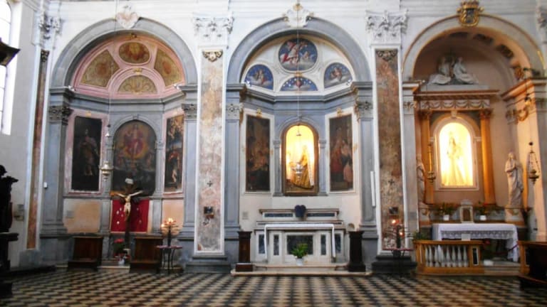 Die im 15. Jahrhundert wiederaufgebaute und im 18. Jahrhundert renovierte Kirche hat eine schlichte mittelalterliche Fassade, ist im Inneren jedoch sehr prunkvoll ausgestattet. 2004 wurde die Kirche bei einem Erdbeben beschädigt und 2010 wurden diese Schäden beseitigt. Auf dem Kirchplatz vor dem Eingang steht ein sehr schöner Brunnen aus dem 16. Jahrhundert.