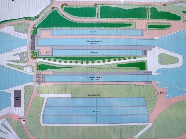 Die Schleuse Uelzen bei Esterholz am Elbe-Seitenkanal überwindet einen Höhenunterschied von 23 m. Gemäß Infotafeln hat sie eine Kammerlänge von 190 m und 12 Meter Breite und ist somit eines der größten Schleusenbauwerke Europas. Es gibt 2 Schleusenkammer, die direkt nebeneinander liegen. Neben den Schleusen findet man die Sparbecken, in denen bei einer abwärts führenden Schleusung 60% des Kammerinhaltes „zwischengelagert“ werden. Die restlichen 40% fließen in den unteren Kanal ab. Wer sich für ingenieurtechnische Bauwerke interessiert hat hier eine Menge zu sehen. Zu bestimmten Terminen gibt es Führungen.