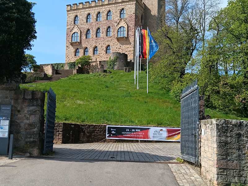 Kästenburg, Maxburg, Hambacher Schloss - diese drei Namen hatte der markante Bau auf dem 325 m hohen Vorberg der Haardt. Der Name Schloss ist etwas zu hochgestellt, eigentlich ist es eine Burg. Die Auffahrt ist gleichzeitig auch Parkplatz, da sie eine Einbahnstraße ist und links am Rand, gegen Gebühr, geparkt wird. Zu Fuß sind es dann je nach Parkplatz ca. 15 Minuten. Das Schloss ist sehr modern renoviert. Mit einem Aufzug kommt man in die oberen Geschosse. Dort ist die Ausstellung über das Hambacher Fest und das Geschehen von 1832. „Hinauf, hinauf zum Schloss!“ – so heißt die Ausstellung. Im Mai 1832 trafen sich 30 000 Menschen aus allen Staaten des Deutschen Bundes, um eine einheitliche Verfassung zu fordern. Das Schloss wird deshalb oft als Wiege der Demokratie bezeichnet.