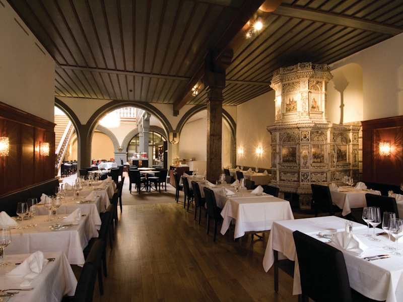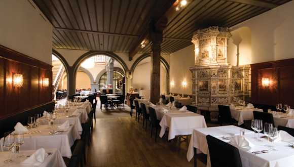 Restaurant Schlüsselzunft Essen à la carte in der Zunftstube beim Kachelofen, preiswerte Tellergerichte im Bistro unter der Glaskuppel und erlesene Weine verbinden sich in Basels ältestem Zunfthaus zu modernster Gastronomie – marktfrische Küche garantiert. Andreas Uebersax und seine Crew sorgen für geschmackvolle Abwechslung – vom Gourmetmenu mit begleitenden Weinen bis zum hausgemachten Sorbet. Erleben Sie ungezwungene Momente in über 600 Jahre alter Geschichte. Der Zunftsaal aus dem 19. Jahrhundert für Bankette bis zu 140 Personen und die geschichtsträchtige Vorgesetztenstube für bis zu 30 Personen runden das Angebot ab. Das Zunfthaus stammt aus dem 14. Jahrhundert und wurde 2007 umfassend renoviert und restauriert. Zu Recht wurde es mit dem ICOMOS-Sonderpreis (Internationaler Rat für Denkmäler und historische Stätten) ausgezeichnet. Das riesige Wandgemälde von Samuel Buri und der Kachelofen aus dem 19. Jahrhundert verbindet Tradition mit modernen Designelementen und junger Gastfreundschaft von Herzen. Anschrift Restaurant Schlüsselzunft Freie Strasse 25 CH-4001 Basel Telefon: +41 61 261 20 46 Fax: +41 61 261 20 46 E-Mail: kontakt@schluesselzunft.ch Web: www.schluesselzunft.ch Anreise mit Öffentlichem Verkehr Vom Bahnhof SBB mit den Tramlinien 8 und 11 Vom Badischen Bahnhof mit der Tramlinie 6 www.bvb.ch Anreise mit Auto In 10 Gehminuten Entfernung befinden sich die Parkhäuser Storchen, Elisabethen, Steinen und City www.parkhaeuser.bs.ch