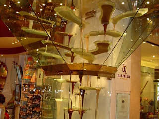 Der Schokoladenbrunnen mit seinen 3 Sorten, weiß, braun und dunkelbrauner Schokolade ist wohl mit seinen 4 Metern Höhe der größte der Welt. Er ist komplett aus Glas gefertigt und hat 25 Schalen in die die flüssige Schokolade fließt. Leider befindet sich das Kunstwerk hinter einer Glasscheibe und man kann nicht die Schokolade probieren, wie im Schokoladenmuseum in Köln. in der Jean Philippe Pâtisserie gegenüber gibt es jedoch in allerbester Qualität Kuchen, Torten, Pralinen und Eis in vielen Sorten. Nicht billig, aber sehr lecker !