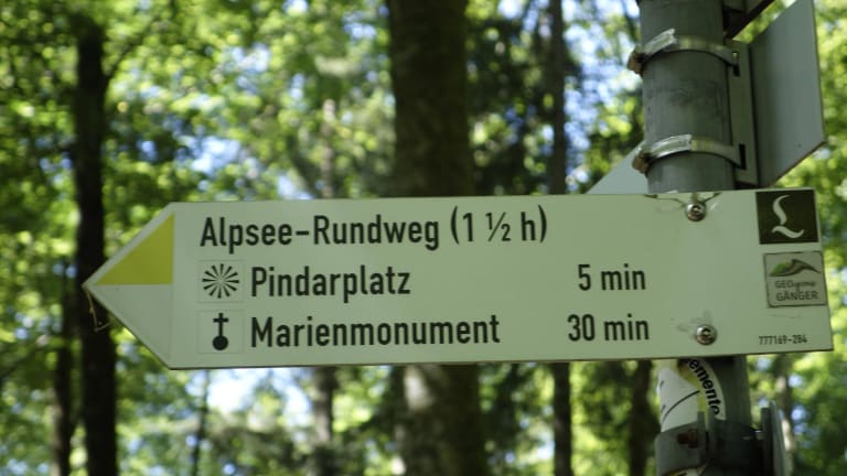 Es gibt einen feinen Wanderweg, der vom Schwansee zum Alpsee führt und das Parkproblem sogleich löst. Man ist dann nicht auf die gebührenpflichtigen Parkplätze an den Schlössern angewiesen. Es gibt einen Parkplatz am Schwansee, den man aber nur entdeckt, wenn man den Stadtplan vom Touristeninfo in Füssen hat, der auch nichts kostet. Manchmal hat man dort sogar einen schattigen Platz. Ich schlage vor, den Schwansee am nördlichen Ufer zu umrunden, dann kommt man sogar an den Badebrücken des Sees vorbei, bei schönem Sommerwetter ein herrliches Bad. Nach 3/4 tel des Weges, sieht man die Hinweistafel >FischersteigMarienmonument< nach. Dann kommt man zu dem Hinweisschild Pindarplatz. Den Weg sollten sie in jedem Fall gehen, denn dort befindet sich ein Ausblicksplatz mit den schönsten Aussichten auf Neuschwanstein, den See und auf das Museum. Weiter geht es zum Marienmonument am See, den sie dann gut umrunden können. Zurück geht es dann über die Fürstenstraße bis zur Hinweistafel >Schwansee