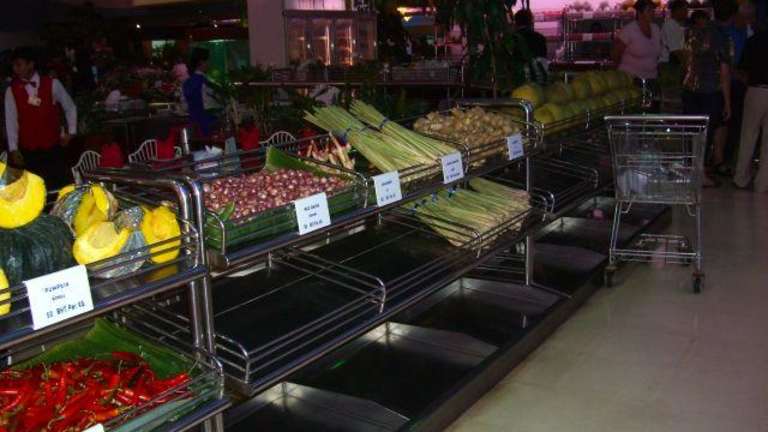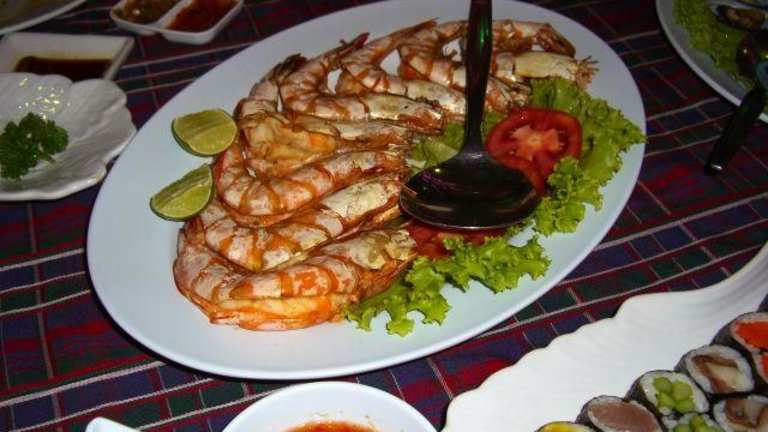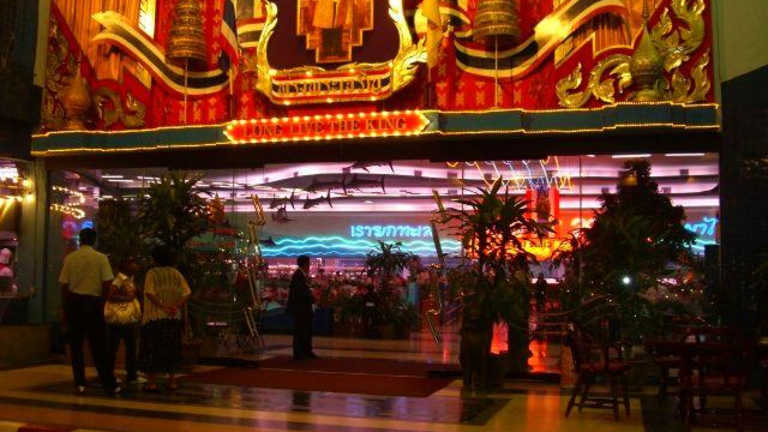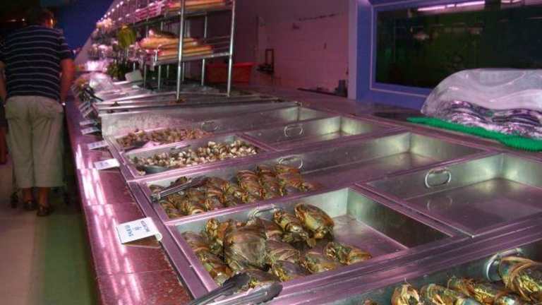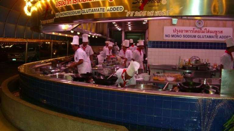 Wer alles was aus dem Meer kommt mag, ist hier genau richtig. Die etwas andere Art zu dinnieren. Man kommt in ein Art Markthalle, ca. 1200 Sitzplätze drinnen und ca. 200 Sitzplätze im Außenbereich. Wenn man den Seafoodmarket betritt bekommt man einen Sitzplatz zugewiesen, je nach Besucherzahl ist eine freie Platzwahl nur bedingt möglich. Man hat einen eigenen Tischkellner, dieser kommt und nimmt die Getränkebestellung auf und erklärt einem die Vorgehensweise, so weit noch nicht bekannt. Dann erhält man Plastiktüten und einen Einkaufswagen und geht wie zu Hause einkaufen. An einer ca. 250 m langen Eisauslage findet man nun alles was das Meer hergibt. Hier sucht man sich nun alles zusammen auf was man Hunger hat und packt dies einzeln in die Plastiktüten. Wichtig ist nur, dass man auch an die Zutaten wie z.B. Brot, Knoblauch, Gemüse, Kartoffeln etc. denkt. Hat man nun alles eingekauft geht man an die Kasse und bezahlt die Ware. Dann kehrt man mit seinem vollen Einkaufswagen an den Tisch zurück. Nun kommt der Tischkellner und nimmt jede Tüte in die Hand und fragt, was in der Küche damit gemacht werden soll. Fisch z.B. gebraten, gegrillt, gekocht usw. oder Brot mit Knoblauch bestreichen. Wenn alles notiert ist geht der Kellner mit dem Wagen in die Küche. Hier wird nun alles so zubereitet wie man es gewünscht hat. So nach und nach kommen die fertigen Gerichte und man kann mit dem Essen loslegen. Einfach nur genial, sollte man gemacht haben. Im Anschluß bezahlt man nun noch die Getränke und die Essenszubereitung. Wir (2 Personen) haben für ein fürstliches Essen plus Getränke (Cocktails) zusammen ca. 35,00 Euro bezahlt. Lagebeschreibung: Mit der Hochbahn -Sukhumvit Line- bis zur Station E5 "Phrom Phong" fahren. Seafood Market and Restaurant Co. Ltd. 89, Sukhumvit Soi 24 (Kasame), Sukhumvit Rd. Klongtoey, Bangkok 10110, Tel. 0-2661-1252-9, www.seafood.co.th Hinweis/Insider-Tipp: Diese Art zu essen ist zwar für thailändische Verhältnisse sehr teuer aber für uns Europäer immer noch preisgünstig, wenn man sieht was man dafür bekommt. Bitte nur so viel einkaufen wie man essen kann. Man verliert schnell den Überblick bei dem was man einkauft denn es ist alles irgendwie lecker und man kann sich nur schwer entscheiden. Ausstattung: mit Terrasse / Garten