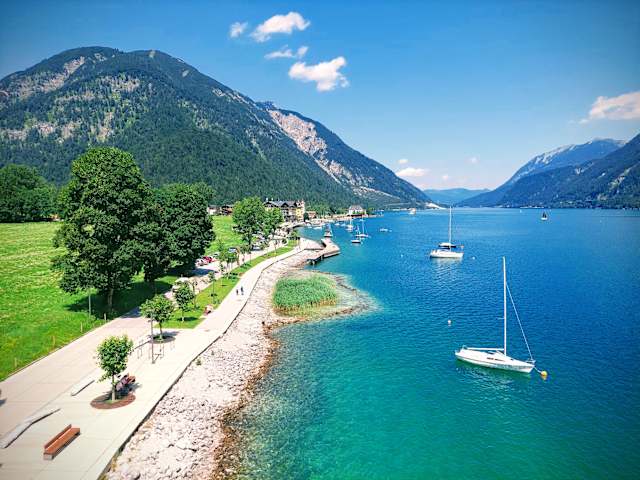 Die Seepromenade in Pertisau am Achensee ist natürlich vollauf die Touris ausgerichtet und erstreckt sich den gesamten See entlang. Sein Fahrzeug sollte man vor Pertisau parken, ab hier kann man die Promenade entlang den tollen Fußweg erkunden, für die Radfahrer wurde ein geteerter Weg gebaut, gutes Schuhwerk sollte nicht fehlen. Viele Stege gehören den ansässigen Hotels vor Ort, jedoch gibt es auch freie Bereiche, hier liegen dann die Sonnenhungrige. Naturschutzzonen wurden am See eingerichtet, hier finden Enten etc. ihren Bereich. . Adresse: Pertisau 6213, Österreich