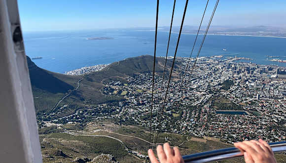 Der Tafelberg, für Kapstadt ein Wahrzeichen wie der Zuckerhut für Rio, ist ein sehr beliebtes Ausflugsziel. Das sieht man schon an den Massen von Besuchern, die sich hier drängeln. Um die mehr als 500 Meter hohe Steilwand zu überwinden empfiehlt sich auf jeden Fall die Seilbahn. Die Fahrt mit der Seilbahn bietet schon auf dem Weg nach oben einen herrlichen Ausblick. Die Gondel dreht sich um 360° - es ist also egal auf welcher Seite man sitzt, der Ausblick „kommt vorbei“.