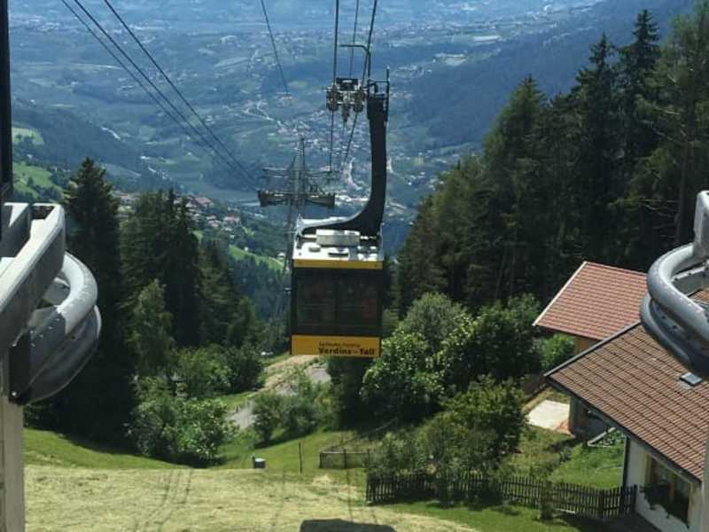 Im Mai 2021 wurde die neue Seilbahn Verdins-Tall fertiggestellt. Verdins ist ein Ortsteil von Schenna auf ca. 840 m Höhe, und von Schenna sehr gut mit dem Bus zu erreichen. Von der Endhaltestelle in Verdins führt ein Fußweg in ca. 10 Minuten zur Talstation der Seilbahn. Mit der Gästekarte Schenna kostete die Berg- und Talfahrt 11,00 € für Erwachsene. In Coronazeiten war der Zutritt auf 25 Personen begrenzt. In wenigen Minuten erreichte man die Bergstation. Dort oben gibt es zahlreiche Wanderwege. Auf der homepage der Verdinser Seilbahn gibt es die Info zu Preisen, Wanderungen und mehr. http:// www.verdins.it/de/ Wer noch höher hinaus möchte, kann dort oben mit dem Sessellift Tall - Grube direkt ins Hirzer Wandergebiet weiterfahren. Man sollte sich einen Tag mit guter Bergsicht aussuchen, denn die Aussicht von dort oben ist einfach nur toll.