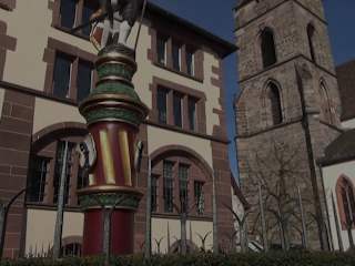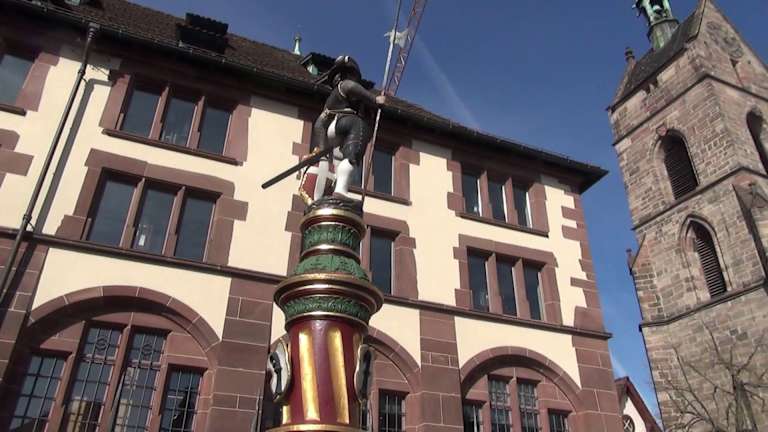 Der Sevogelbrunnen steht auf dem Martinskirchplatz in Basel. Der Brunnen besteht aus einem sechseckigen Brunnentrog und einer Säule mit einer Figur. 1898 wurde das Staatsarchiv auf dem Areal des Rathausgartens erbaut. Bei dieser Baumaßnahme wurde auch der Brunnen mit einem neuen Stock aufgewertet. Die Säule stammte indes von einem anderen Brunnen. Die Säule ist bordeauxrot, drapiert mit grünen Blättern und goldfarbenen Ringen. Die Mitte der Säule verzieren längliche goldige Einlassungen, die leicht nach links geneigt sind. Auf ihnen sind, verteilt um die Säule, drei Baslerstäbe angebracht. Adresse: Martinskirchplatz 4, 4051 Basel, Schweiz Webseite: https://de.wikipedia.org/wiki/Sevogelbrunnen Geodaten: HH5Q+FG Basel, Schweiz