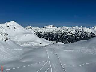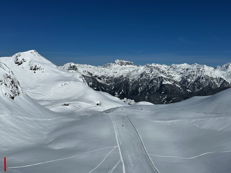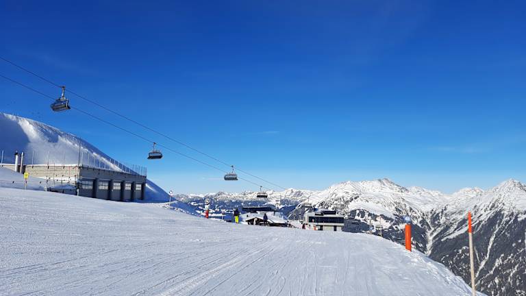 Obwohl in Schruns selbst alles "grün" war, waren die Schneeverhältnisse auf dem Hochjoch doch sehr gut. Die Mittelstation Kapell erreicht man entweder von Schruns Ortsmitte mit der Kabinenbahn oder etwas außerhalb des Ortes Schruns mit kleineren Gondeln. Natürlich kann man vom Kapell wieder abfahren, aber empfehlenswert ist mit dem Sennigrat Sessellift weiterhinauf zu gondeln. Leider ist dieser Sessellift häufig überfüllt, man muss morgens mit längeren Wartezeiten rechnen, weil er die einzige Anbindung an das höhergelegene Skigebiet ist. Dieser 2-er-Sessellift müsste meines Erachtens dringend verbessert werden und die Kapazität erhöht werden. Oben angekommen sollte man dann noch zum Kreuzjoch fahren. Von dort hat man viele Möglichkeiten. Sehr schön und kaum befahren ist das Grasjochgebiet. Interessant ist auch die lange "blaue" Abfahrt vom Kreuzjoch, die durch das längste Skitunnel der Welt führt. Es hat mich überrascht, dass trotz der milden Witterung so gute Pistenverhältnisse vorzufinden waren. Sogar die Talabfahrt bis Schruns war dank beschneiter Piste möglich. Lagebeschreibung: www.hochjoch.com, www.montafon.at