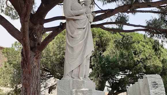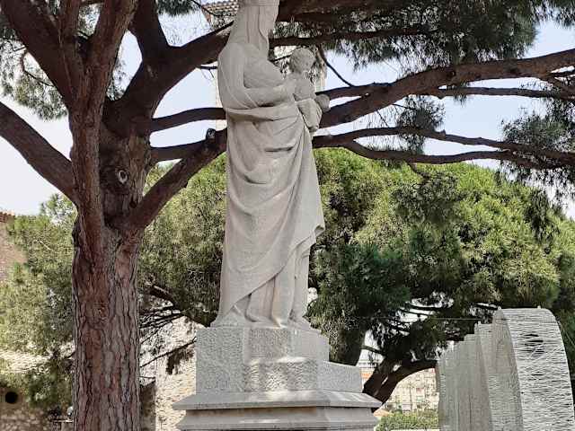 Die steinerne Skulptur am höchsten Punkt des Suquet-Hügels stellt die Jungfrau Maria mit einer Krone dar, die das Jesuskind in ihren Händen hält. Die Statue wurde 1948 im Hof der Burg errichtet als Dank für den Schutz der Stadt während des II. Weltkrieges.