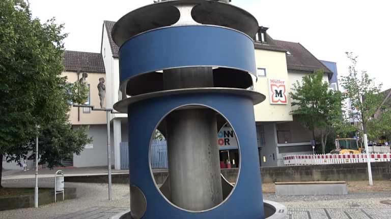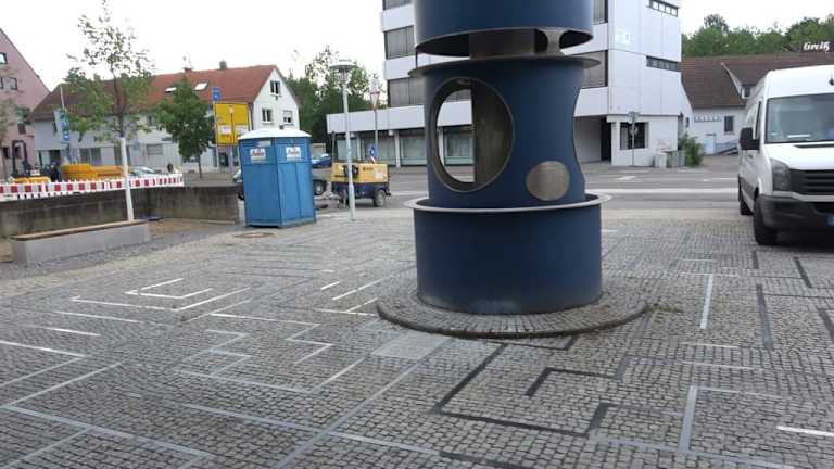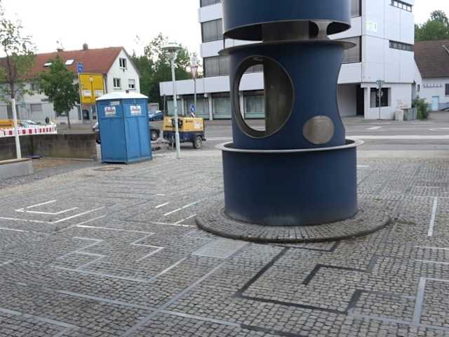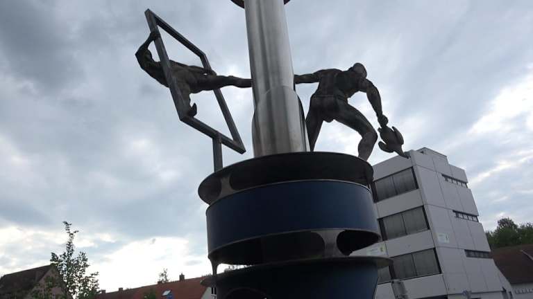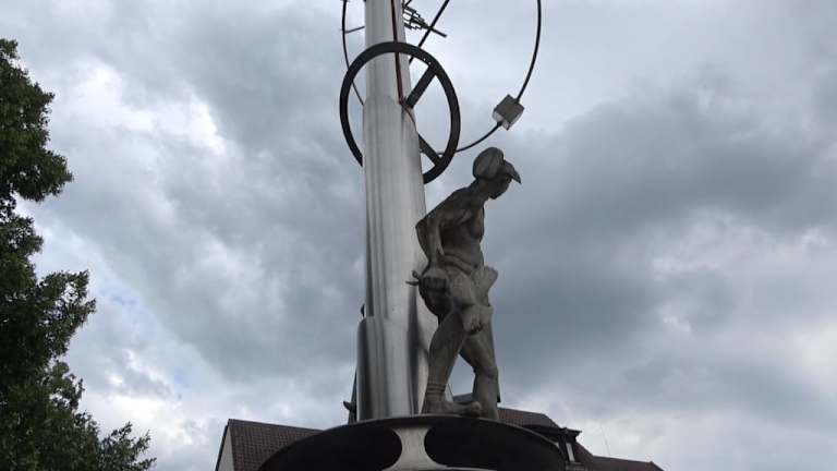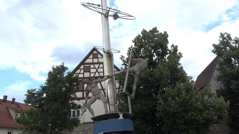 Die Skulptur ist eine verschlüsselte Darstellung der Hinrichtung von Rathgeb - er wurde zum Tode verurteilt und vermutlich durch Vierteilung hingerichtet. Ein Hinweis auf die Zeit des Bauernkrieges. Das Labyrinth symbolisiert den verschlungenen Lebensweg. Der Pendelschlag steht auf dem Platz beim Bronntor.