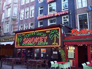 Nach 10 Jahren und mittlerweile 4x Amsterdam ist und bleibt mein Lieblingscoffeeshop das SMOKEY am Rembrandtplein. Die Atmosphäre ist sehr legere und relaxed, außerdem gibt es hier immer während den Öffnungszeiten einen Türsteher, der rigoros das Mindestalter von 18 Jahren kontrolliert (und dieser Typ ist wirklich gut - hab da mal beobachtet, wie er aus einer Gruppe von gut 10 Leuten genau die jene rausgefischt hat, die erst 17 war). Früher hat man ja in den Coffeshops auch Alkohol ausgeschenkt, seit 01. 06.06 ist dies jedoch verboten und somit bekommt man nur mehr Softdrinks aller Art. Im Smokeys kann man auch Billiard spielen, sich Life-Musik anhören oder einfach Marihuana oder Hasch rauchen - entweder man kauft sich zB einen fix-fertigen Joint oder eben nur die gewünschte Sorte zum Selberbauen ... Das Angebot variert von ganz feinem Gras bis hin zu einer doch sehr starken "White Widow" ...