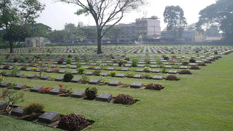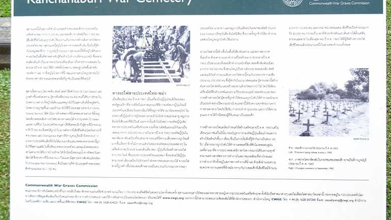Nicht weit von der „Brücke am Kwai-Fluss“ befindet sich der Kriegsfriedhof in Kanchanaburi. Dieser Friedhof erinnert an die Gräueltaten, die während des Zweiten Weltkriegs begangen wurden, Auf diesem Friedhof sind 6982 Gefangene der Alliierten (Engländer, Australier und Holländer ) bestattet, die beim Bau der berüchtigten „Todeseisenbahn“ über den Fluss Kwai nach Birma unter den Japanern ihr Leben lassen mussten. Jeden Gefallenen wurde zum Gedenken ein Grabstein mit seinen Namen errichtet. Es ist ein Ort zum Nachdenken, denn es waren ja meist sehr junge Soldaten, die aufgrund des Baus der Bahnlinie hier unter mörderischen Bedingungen ums Leben kamen. Es fällt schwer einen Friedhof zu "empfehlen", aber wer sich mit der Geschichte des Zweiten Weltkriegs in Thailand auseinandersetzt, sollte hier einen Zwischenstopp einzulegen Die Grabinschriften sind teilweise sehr traurig, verleiten aber dazu, wieder einmal über das Leben nachzudenken!