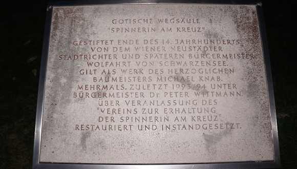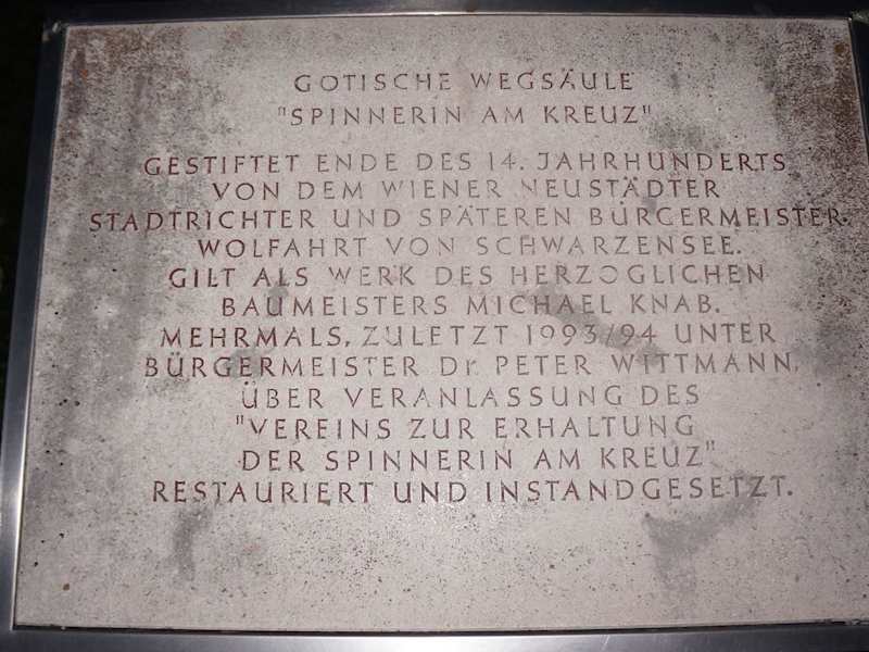 Die Spinnerin am Kreuz gibt es in Wien und in der Wiener Neustadt. Es ist ein 21 Meter hohe gotische Steinsäule, die sich nach oben immer mehr verjüngt. Es zeigt viele verscheidenen Figuren und ist ein Highlight in der Stadt. Der drum herum angelegte Walther von der Vogelweide-Park ist sehr nett.