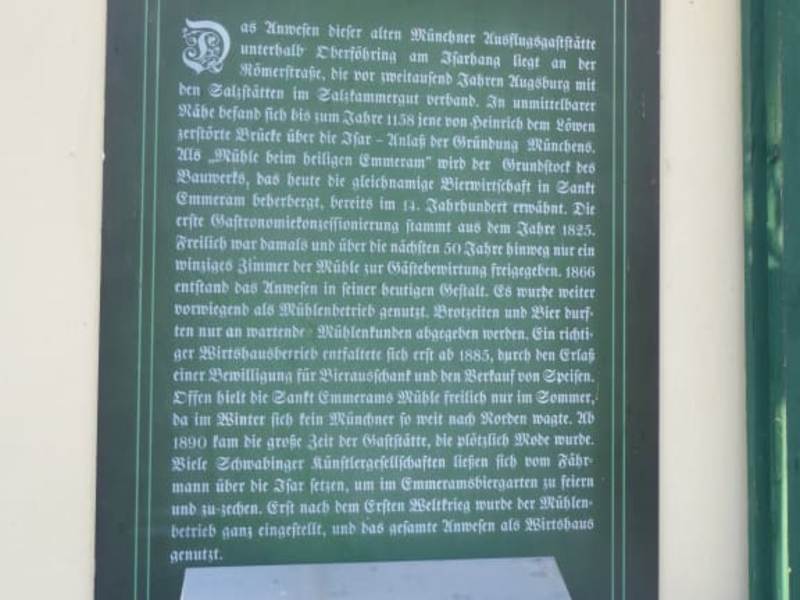 Geht man von der Endhaltestelle der Straßenbahn 37 aus die St,Emmeramstr. bergab zum Isarkanal hinunter, befindet sich auf der linken Seite die Emmeramkapelle und auf der rechten Seite die Gaststätte St, Emmeramsmühle. Benannt ist die St. Emmeramsmühle, wie der gesamte Ortsteil St. Emmeram nach dem heiligen Bischof Emmeram von Regensburg, dessen Leichnam bei seiner Überführung nach Regensburg hier eingeschifft worden sein soll. Am Eingang zum Restaurant befand sich eine interessante geschichtliche Hinweistafel zur St. Emmeramsmühle. Es stand u.a. darauf zu lesen: Das Anwesen dieser alten Ausflugsgasstätte unterhalb von Oberföhring am Isarhang liegt an der Römerstraße, die vor zweitausend Jahren Augsburg mit den Salzstätten im Salzkammergut verband. In unmittelbarer Nähe befand sich bis zum Jahre 1158 jene von Heinrich den Löwen zerstörte Brücke über die Isar – Anlass der Gründung Münchens. Als „Mühle beim heiligen Emmeram“ wird der Grundstock des Bauwerks, das heute die gleichnamige Bierwirtschaft in St. Emmeram beherbergt, bereits im 14.Jahrhundert dort erwähnt. Die erste Gastronomiekonzessionierung stammt aus dem Jahre 1825. Freilich war damals und über die nächsten 50 Jahre hinweg nur ein winziges Zimmer der Mühle zur Gästebewirtung freigegeben.Ein richtiger Wirtshausbereich entfaltete sich erst ab 1885. Ab 1890 kam die große Zeit der Gaststätten die plötzlich Mode wurden. Viele Schwabinger Künstlergesellschaften ließen sich vom Fährmann über die Isar setzen, um im Emmeramsgarten zu feiern und zu zechen. Erst nach dem Ersten Weltkrieg wurde der Mühlenbetrieb ganz eingestellt, und das ganze Anwesen als Wirtshaus genutzt. Da wir einen sonnigen Herbsttag hatten, suchten wir uns einen freien Platz im Biergarten von der St. Emmeramsmühle. Da wir nur eine Kaffeepause einlegen wollten, bestellten wir 1 Haferl Kaffee, 1 Tasse Kaffee, 2 Käsekuchen mit Sahne. Der Kaffee und der Kuchen wurden uns nach ca.10 Minuten von einem sehr freundlichen Kellner gebracht. Wir bezahlten für Kaffee und Kuchen 17,80 Euro. Die Corona-Regeln wurde vom Personal eingehalten. Im Falstaff Restaurant Guide wurde die St. Emmeramsmühle am 5. April 2018 als einer von Münchens fünf besten Biergärten bezeichnet. Auch der FC Bayern München richtete schon Meisterfeiern im Restaurant Sankt Emmeramsmühle aus. Gleich neben dem Biergarten St. Emmeramsmühle im sogenannten Krautgarten grasen sogar noch Ziegen und Schafe. Etwa 5 Minuten entfernt von der Gaststätte an der Isar, befindet sich die bekannte St.Emmeram Statue. Die Bronzefigur wiegt 330 Kilogramm und ist 2,60 Meter hoch. Der Biergarten hat uns sehr gut gefallen