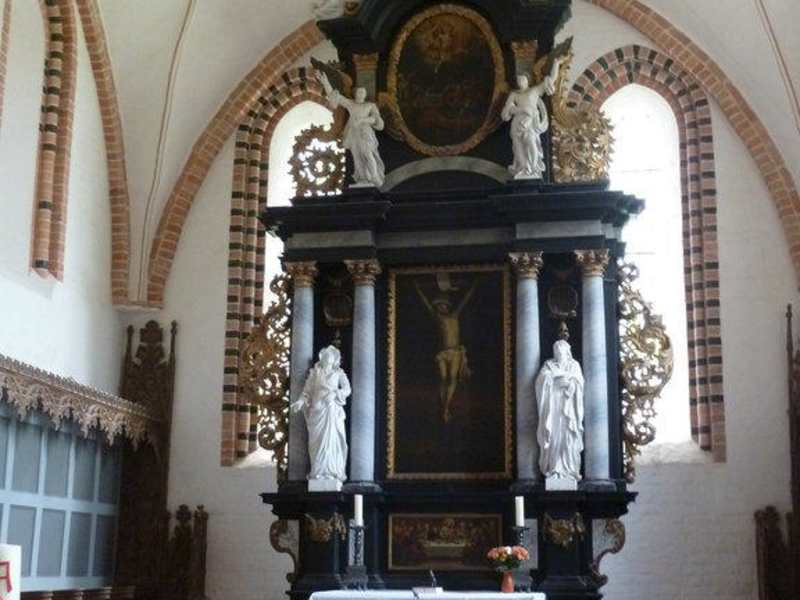 Die Backsteinkirche von Klütz kann man nicht übersehen, liegt sie doch an einer reich befahrenen Kreuzung mitten in Klütz. Erstmals wurde die Kirche St. Marien um 1250 erwähnt. Der zweijochige Chor - erbaut ca. 1230 - 1240 - ist der älteste Teil der Kirche. Das Chorgestühl an der Südwand des Altarraums stammt aus dem 14. Jahrhundert. Der Taufstein aus dem 13. Jahrhundert findet heute noch Verwendung. Der Barockaltar stammt von 1730. Auf seiner Rückseite ist eine Tafel, an der alle 22 Pastoren seit der Reformation verzeichnet sind. Der Turm wurde wohl im 15. Jahrhundert errichtet und sein Wahrzeichen ist der achteckige Helm in Form einer Bischofsmütze. Man sagt, dass sich der "Klützer Winkel" soweit erstreckt, wie man von diesem Turm sehen kann. Der Eintritt in die Kirche ist kostenfrei, aus einem kleinen Faltblatt bekommt man die wichtigsten Informationen zur Kirche.