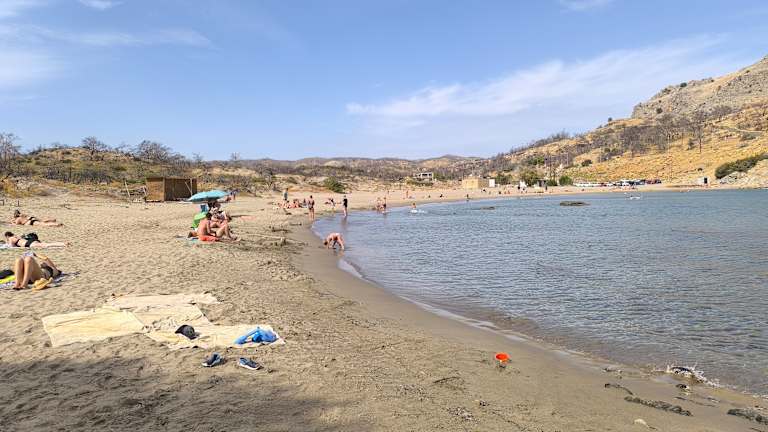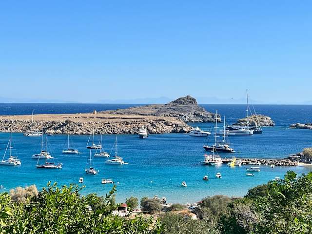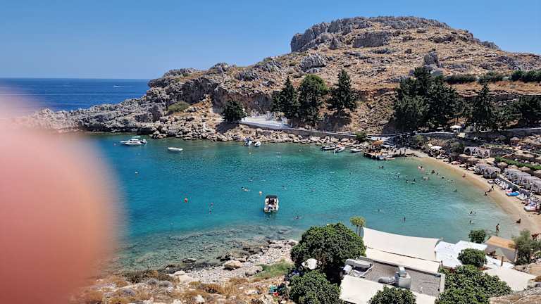 Die kleine Bucht wirk von oben (aus Richtung Akropolis) sehr ruhig und idyllisch. In Wirklichkeit ist die Bucht völlig überlaufen. Es gibt von Lindos aus eben nicht viele Badestellen, die zu Fuß erreichbar sind. Einen kurzen Abstecher ist sie aber wert.