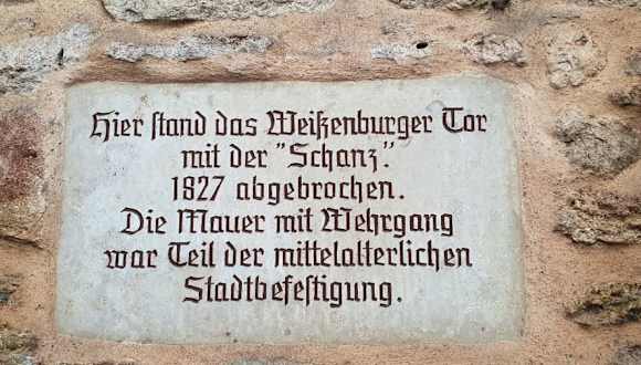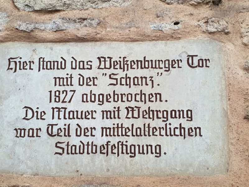 Gleich nach dem Färberturm kann man das letzte Teilstück des Wehrgangs noch besichtigen, hier war früher das Weißenburger Tor mit der Schanz das im Jahre 1827 abgebrochen wurde, es ist das letzte der gesamten Stadtbefestigung in Gunzenhausen. . Adresse: Weißenburger Straße 91710 Gunzenhausen