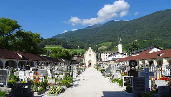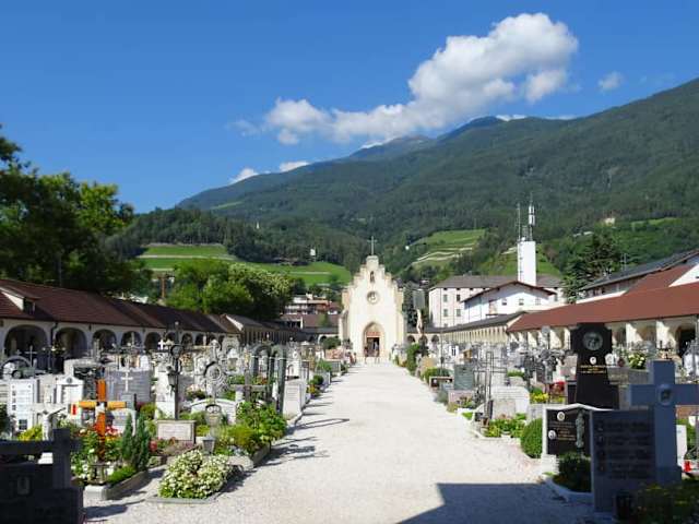 Während sich Brixens „Alter Friedhof“ direkt neben der Pfarrkirche befindet und bis zum 30.12.1793 als Begräbnisstätte der Stadt diente, wurde danach der „Stadtfriedhof“ in der Romstraße geweiht – er ist bis heute die letzte Ruhestätte der Brixener und lohnt einen Besuch: Von hohen Mauern umschlossen, betritt man durch den Haupteingang das 160 mal 40 Meter messende Areal, welches von einem Hauptweg zur Kapelle geteilt wird. Die Einfassungsmauern des Stadtfriedhofes bilden gleichzeitig die Rückwand einer umlaufenden Arkadenreihe, deren Gedenksteine und Grabstellen den Honoratioren der Stadt vorbehalten bleiben, etwa den Theologieprofessoren, Capitularen des Domkapitels und Grabstätten der Kapuziner. Bei aller Traurigkeit, die mit der schmerzlichen Erinnerung an geliebte Menschen verbunden ist, kann man auf dem Stadtfriedhof auch eine ganz andere, sehr versöhnliche Seite erleben: Sonne über den Reihen der Gräber und der unverstellte Blick auf die bewaldeten Hügel des Eisack-Tales, eine üppige Blumenpracht zwischen Engeln und Kreuzen und das Gefühl, durch eine ganz bewusst enge Anordnung der Grabstellen niemand bei seinem letzten Gang alleine gelassen zu haben - der Stadtfriedhof von Brixen ist ein stiller Ort zum Innehalten und Nachdenken.