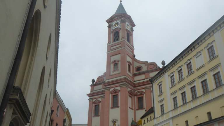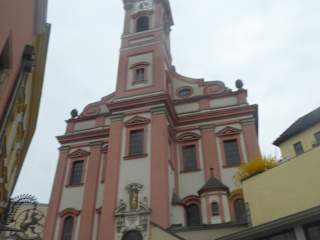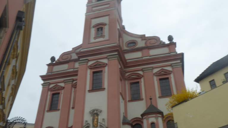 Diese alte Kirche steht in der Altstadt von Passau. Sie wurde erstmalig 1050 erwähnt. Der eigentliche Bau, wie man die Kirche heute sieht wat um1660 bis 1673. Die Kirche fällt durch ihre rosa Farbe sofort ins Auge. In den Stufen zum Eingang befindet sich 1 kleine Opferkapelle. Die Kirche ist mit ihrem Hochaltar und div. Seitenaltaren sehr gut erhalten. Es gibt eine schöne Orgel die wir vor Ort erlebten.