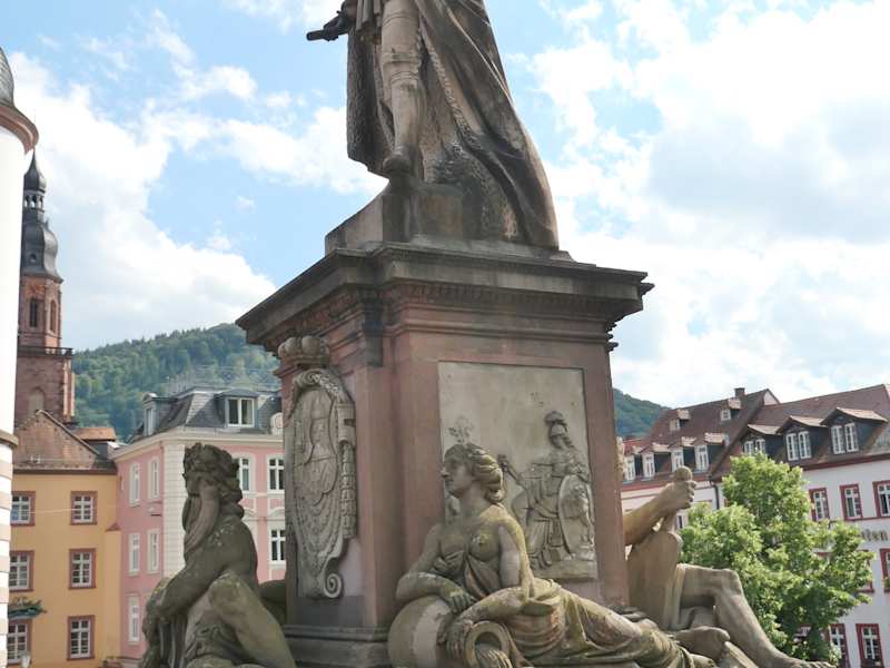 Auf der Karl-Theodor-Brücke (bekannt auch als Alte Brücke) befinden sich zwei Statuen. Eine dieser Statuen stellt den Bauherrn der Brücke, den Kurfürsten Karl Theodor (Carl Theodor) dar. Karl Theodor (geboren 1724, gestorben 1799) war ab dem 31.12.1742 als Karl IV. Pfalzgraf und Kurfürst der Pfalz und ab dem 30.12.1777 als Karl II. zusätzlich Kurfürst von Bayern. Wenn man von der Heidelberger Altstadt aus zur Alten Brücke kommt, befindet sich die übergroße Statue des Kurfürsten Karl Theodor auf der Brücke auf dem zweiten Brückenpfeiler auf der linken Seite. Der Kurfürst steht in heldenhafter Pose auf dem Denkmalsockel, zu seinen Füßen befinden sich vier liegende allegorische Figuren, welche die vier wichtigsten Flüsse seines Machtbereiches symbolisieren: Rhein und Mosel (in der Pfalz), sowie Donau und Isar (in Bayern). Die Statue des Kurfürsten Karl Theodor, die sich heute auf der Alten Brücke befindet, ist eine Kopie, die 1788 aufgestellt wurde. Die Original-Statue befindet sich inzwischen im Kurpfälzisches Museum Heidelberg. Obwohl es sich also um eine Kopie handelt, ist dieses Denkmal durchaus beachtenswert. Übrigens, auf dem siebten Brückenpfeiler auf der linken Brückenseite, kurz vor dem nördlichen Neckar-Ufer, befindet sich die Statue der römischen Göttin Minerva (die auf griechisch Pallas Athene genannt wird). Auch die Minerva ist eine Kopie, deren Original sich ebenfalls im Kurpfälzischen Museum Heidelberg befindet.
