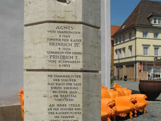 Schwäbisch-Gmünd darf sich die älteteste Stauferstadt nennen, auch hier gibt es eine Stauferstele. Keine Stadt die mit den Staufern zusammen hängt, hat ein älteres Dokument über diese Zeit. Die Staufer, das Adelsgeschlecht regierte vom 11. bis zum 12. Jahrhndert. Damals war der Name nicht unbedingt zeitgemäß, er leitet sich heute ab von der Burg Hohenstaufen, eine Burgruine im Kreis Göppingen. Mit den Staufern verbinden sich so berühmte Namen wie Friedrich I. Barbarossa, Heinrich und Friedrich II. die auf Sizilien regierten. Heute zählt man 38 Stelen in Städten die mit den Herrschern der damaligen Zeit zusammen hingen.