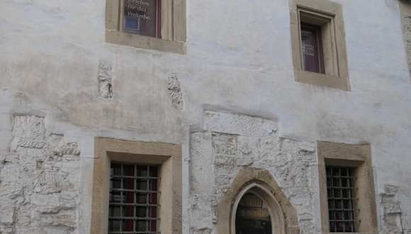 In Erfurt befindet sich in der Rathausgasse, zwischen der Touristeninformation (Benediktsplatz 1) und dem Haus zum grossen Paradies und Esel (An der Stadtmünze 10), ein unscheinbares Gebäude. Es ist dies das mittelalterliche „Steinerne Haus“, welches um das Jahr 1200 erbaut wurde. Wie es heißt, ist die farbig bemalte Holzbalkendecke des Raumes im ersten Obergeschoss einzigartig in Europa. Die Balken der Decke wurden auf Zeit um 1241 / 1242 datiert. Das „Steinerne Haus“ kam vermutlich in den 1290-er Jahren in jüdischen Besitz. Als 1348 / 1349 die Pest auch nach Erfurt kam, wurde – wie üblich – den Juden die Schuld daran gegeben – der Vorwurf an die jüdische Bevölkerung war auch in Erfurt Brunnenvergiftung (was als Auslöser für die Pest angesehen wurde). Im März 1349 wurden viele Juden und Jüdinnen in Erfurt im sogenannten Pestpogrom ermordet (manche konnten sich wohl durch Flucht der Ermordung entziehen). Spätestens zu diesem Zeitpunkt mussten auch die jüdischen Besitzer das „Steinerne Haus“ aufgeben. Seit September 2023 sind das mittelalterliche „Steinerne Haus“ in der Rathausgasse, zusammen mit der mittelalterlichen Mikwe in der Krämerbrücke 7 und mit der Alten Synagoge in der Waagegasse 8 Teil des UNESCO-Weltkulturerbes „Jüdisch-Mittelalterliches Erbe in Erfurt“.