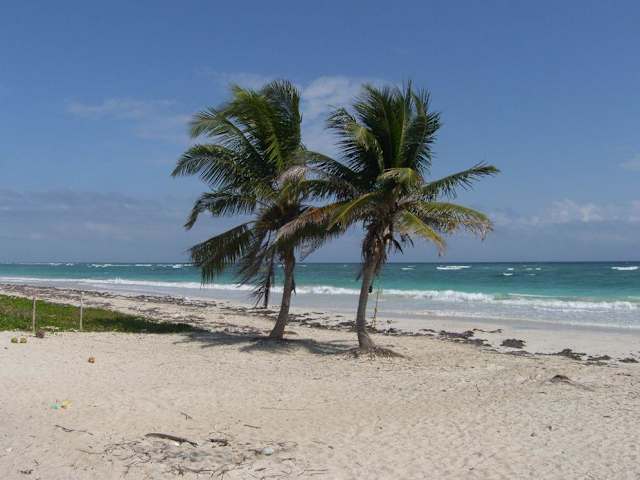 Von der Straße zwischen Xcalak und Mahahual führen mehrere Stichstraßen zum Meer. Wer die Einsamkeit liebt, kommt dort auf seine Kosten. Es gibt dort Strände, an denen man über Kilometer hinweg keine Menschen trifft. Die Strände sind noch völlig natürlich. Man findet das, was das Meer anspült, und es gibt natürlich auch niemanden, der das wegräumt. Im Meer sieht man die Brandung des vorgelagerten Riffs, am Strand wachsen Palmen und grüne Büsche. Leider sind auch noch die Folgen der häufigen Wirbelstürme - besonders von Wilma sichtbar: Einige Palmen sind abgeknickt, Häuser sind Ruinen und wir haben auch Reste von zwei Segelyachten im Wasser liegen sehen.