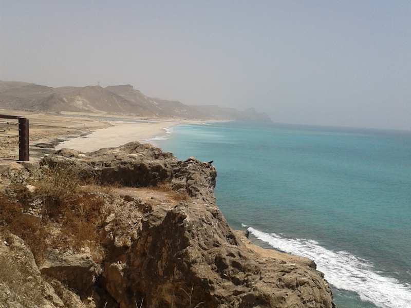 Wer sich von Salalah aus Richtung Westen begibt kommt auch an den wunderschönen Strand von Mughsail. So wie ich das verstehe enden auch hier die meisten gebuchten Ausflüge. Wer allerdings mit dem Auto selbst unterwegs ist, sollte am Ende des Strandes tanken (nächste Tankstelle ?) und weiter Richtung Westen fahren. Es geht einen Pass hinunter und wieder hinauf - gut zum Fahren - und dabei und auch später hat man wirklich schöne Aussichten aufs Meer und ins Hinterland. Zwischendurch gibt es einen Militärstützpunkt, an dem man kontrolliert wird (Pässe! und Führerschein) aber man kommt ohne weiteres weiter.