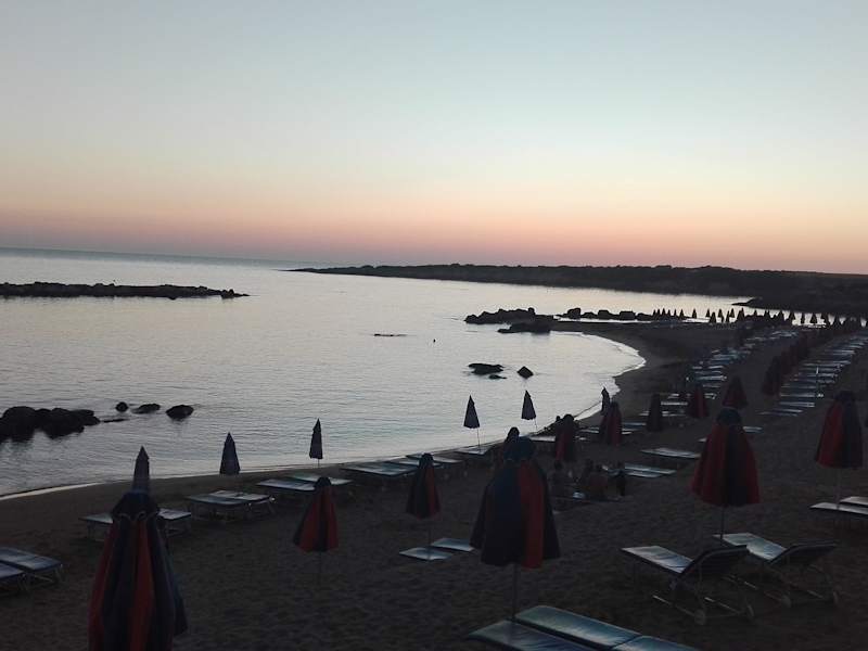 Die „Coral Bay“ nördlich von Paphos besteht aus 2 Buchten: Die eine nennt sich „Paradise-Beach“, die andere „Arapis-Beach“. Zwischen beiden befindet sich die Landzunge von Maa-Palaeokastro. Zuerst waren wir am „Paradise-Beach“, weil sie direkt unterhalb unseres Hotels liegt. Das Meer sicherlich dort schön, aber der Betreiber hält die Strandanlage nicht gut in Schuß. Liegen und Schirme zerschließen, sanitäre Anlagen nicht sauber und nur gegen Gebühr zu benutzen! (s. Foto). Am nächsten Tag gingen wir (nur knapp 15 Minuten länger zu Fuß oder mit dem Bus 615 direkt dorthin) zur „Arapis-Beach“. Was für ein Unterschied! Liegeplätze ordentlich, Abfall wird regelmäßig entfernt, Duschen und WC’s ständig gewischt und KOSTENFREI natürlich. Eine nette Taverne gibt’s dort auch (waren wir aber nicht zum Essen). Klar, dass nun dies unser „Lieblingsstrand“ wurde ;->
