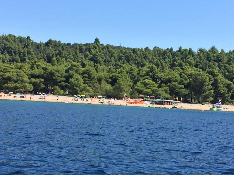 Der Strand ist schön weitläufig und nicht überlaufen. Hier findet jeder sein Plätzchen. Genug Schatten durch Bäume am Rand des Strandes.