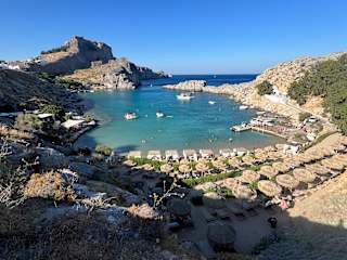 Ein wunderschönes Ausflugsziel ist der Beach von Lindos. Am Besten oberhalb der Stadt parken und runter zum Beach laufen oder mit dem Shuttle-Bus für 0,50€ p.P. hinunter fahren lassen. Der Beach ist aus feinstem Sand und das Wasser klar, Fische und Krebse begegnem einem und wer vor lauter Sonne, Strand und Meer etwas zu trinken oder gar essen möchte ist auch im Nu versorgt.