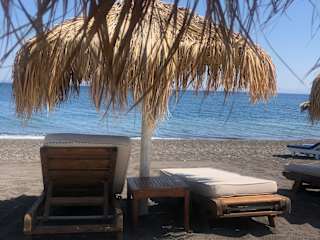Der schwarze Kiesstrand von Santorin bietet mal ein anderen Strandbesuch. Der schöne weitläufige Strand bietet ein schönen Blick auf das Meer. Das Wasser ist Kristall klar, da liegt daran, dass alles aus Steinen und Felsen besteht. Sonnenliegen kosten natürlich eine Gebühr. Wir waren im Hotel und hatten unsere eigenen. Allerdings ein Vergleich vor Ort lohnt. Wie wir erfahren haben, es gibt welche, die wollen 10 €, andere sagen, man muss während dem Tag mindestens 1 Getränk bestellen - und mal ganz ehrlich - im Urlaub kann man sich auch mal ein schönes Bier für 3 Euro am Strand gönnen ;-). Mein Tipp: Ihr benötigt unbedingt Bade bzw. Strandschuhe, mit denen ihr schwimmen gehen könnt. Gibt's natürlich auch am Strand für 14 €, wir haben mit unserem Mietauto einen Halt bei einem normalen Markt gemacht - dort zahlt ihr nur 6 €. Solltet ihr welche besitzen dann einfach einpacken - ohne diese Schuhe rutscht ihr beim reingehen aus, lustig anzuschauen, aber selber will man das nicht. Noch dazu: Schwarzer Kies mega heiß in der Sonne ;-)