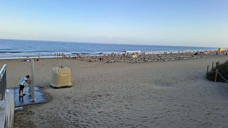 wir sind FKK-Anhänger. Und so nehmen wir auch täglich den langen Weg (denn FKK ist bekanntlich immer am A.... der Welt) in Kauf. Wir kamen täglich um 9:00 Uhr an ca. 5-6 Mal 150 Liegen für Textil-Bader vorbei. Da liegen zu der Zeit je ca. 3 Läute, aber am FKK angekommen, rammeln schon dermaßen viele Urlauber rum, dass man sich schon fast um eine Liege prügeln muss - es ist unglaublich - jeden Tag das Gleiche - aber es werden keine weiteren Liegen aufgestellt oder noch eine Bettenburg davor umfunktioniert, so dass man sich wirklich schon diskreminiert vorkommt. Aber die Kassierer sind bereits vor Ort und belegen ca. 2-3 Liegen mit 3 Sonnenschirmen. Hat Playa del Ingles die Einnahmen nicht nötig? Denn hier könnten sie glatt das Doppelte an Liegen verkaufen!!!
