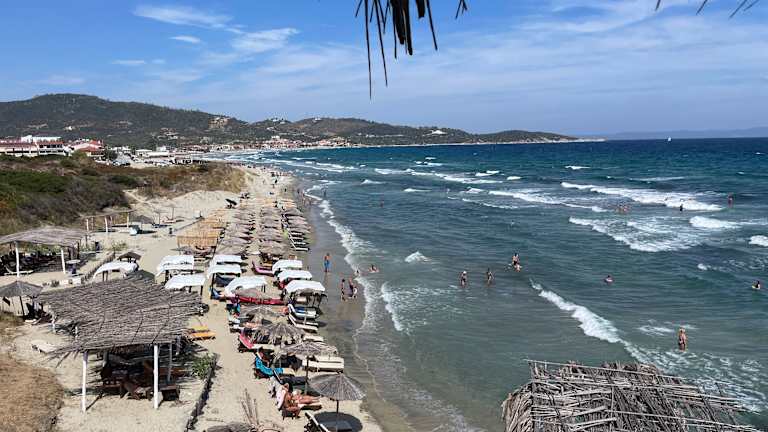 Ein wunderschöner langer feiner Sandstrand,Städchen hintendran zum Bummeln und in der Taverne sitzen zum Essen und trinken.Wenn man an den Bars was trinkt sind die Strandliegen frei !Sauberes klares Wasser wie auf ganz Sithonia