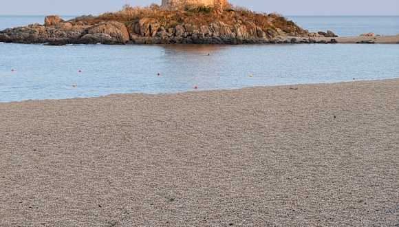 Sehr schöner Strand mit feinkörnigen Kieselsteinen, rötlich ! Wenn man barfuß Richtung Meer geht, peeling pur ! Wenn man früh kommt ergattert man ein Stellplatz im Schatten. Klares Wasser und ein schicker Turm als Fotomotiv.
