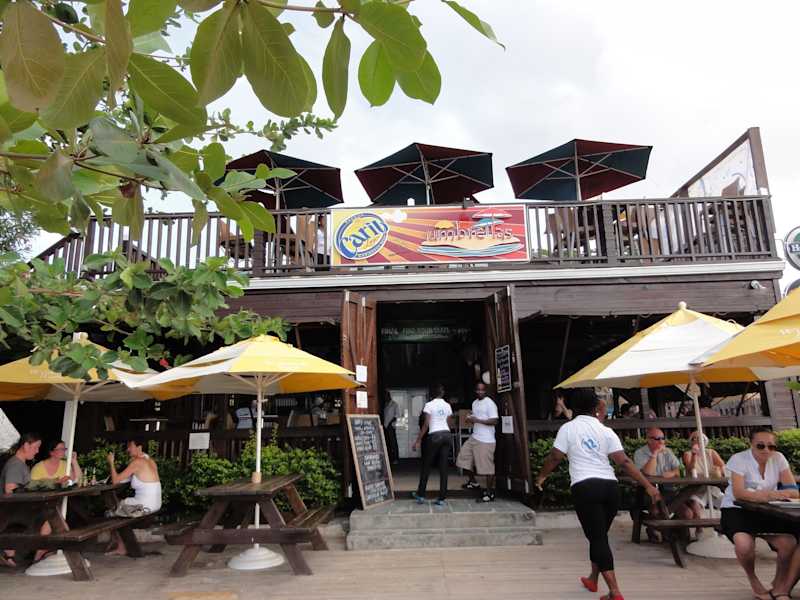 Das Umbrellas liegt direkt am Strand in einer gemütlichen Holzhütte. Es ist rustikal eingerichtet. Auf einer Holzterrasse vor der Bar und auf dem Dach sind auch noch gemütliche Sitzmöglichkeiten zum Chillen. Netter, verspiegelter Barbereich. Es können amerikanische, leckere Gerichte zum akzeptablen Preis bestellt werden; auch die Getränke wie Bier, Wein und Cocktails sind sehr erschwinglich. Als wir da waren, konnten wir die Deutschen gegen die Spanier auf den großen Fernseher Fußball spielen sehen (wir haben natürlich gewonnen!) – es war gute Stimmung und alle haben zu den Deutschen gehalten, obwohl außer uns nur Engländer, Franzosen und Amerikaner da waren. Ansonsten legt ein DJ aktuelle Musik auf. Der Managing Director Wayne De MontBrun hat den Laden gut im Griff – es war sehr sauber, die Kellnerinnen freundlich und aufmerksam (= sahen sofort, wenn Teller oder Gläser leer waren und fragten wegen Nachschub). Kurz: Konkurrenzlose, tolle Strandbar – wer in Grand Anse/St. George auf Grenada Urlaub macht, sollte jedenfalls auch dort einmal vorbeischauen. Lohnt sich!!