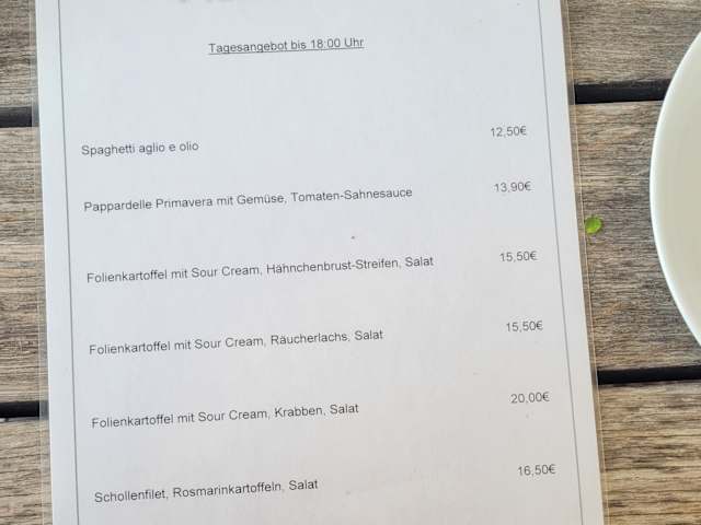Der Ausblick auf der Terrasse ist wie bei den anderen Strandrestaurants in SPO einmalig, aber hier ist das Ambiente schon etwas abgerockt/rustikal, im Gegensatz dazu die Preise atemberaubend! Beispiel: Eine "Ofenkartoffel vegetarisch" für 21,40 € im Tagesangebot muss man erstmal verkraften! Mit Krabben werden es dann 29,90€ - zum Vergleich: in der Arche Noah "Folienkartoffel mit Sour Cream, Salat unf Krabben" 20,00 €, und da sitzt man besser.